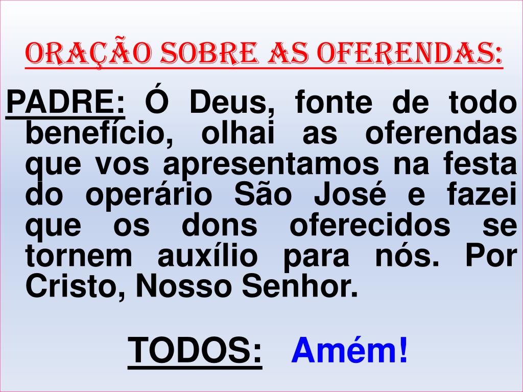 ORAÇÃO SOBRE AS OFERENDAS: PADRE:Ó Deus, fonte de todo benefício, olhai as oferendas que vos apresentamos na festa do operário São José e fazei que os dons oferecidos se tornem auxílio para nós. Por Cristo, Nosso Senhor. TODOS:Amém!