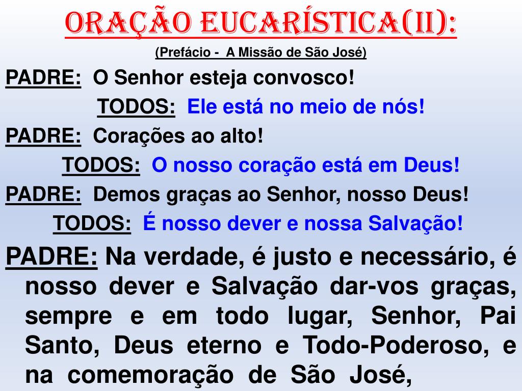 ORAÇÃO EUCARÍSTICA(II): (Prefácio - A Missão de São José) PADRE: O Senhor esteja convosco! TODOS:Ele está no meio de nós! PADRE: Corações ao alto! TODOS:O nosso coração está em Deus! PADRE: Demos graças ao Senhor, nosso Deus! TODOS:É nosso dever e nossa Salvação! PADRE: Na verdade, é justo e necessário, é nosso dever e Salvação dar-vos graças, sempre e em todo lugar, Senhor, Pai Santo, Deus eterno e Todo-Poderoso, e na comemoração de São José,