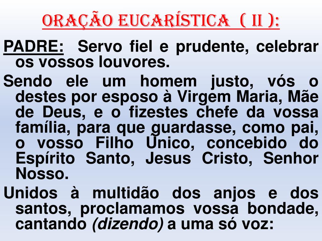 ORAÇÃO EUCARÍSTICA ( II ): PADRE:Servo fiel e prudente, celebrar os vossos louvores. Sendo ele um homem justo, vós o destes por esposo à Virgem Maria, Mãe de Deus, e o fizestes chefe da vossa família, para que guardasse, como pai, o vosso Filho Único, concebido do Espírito Santo, Jesus Cristo, Senhor Nosso. Unidos à multidão dos anjos e dos santos, proclamamos vossa bondade, cantando (dizendo) a uma só voz: