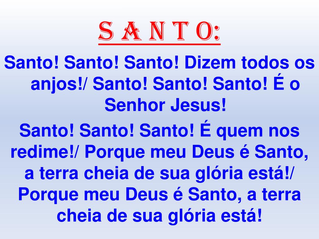S A N T O: Santo! Santo! Santo! Dizem todos os anjos!/ Santo! Santo! Santo! É o Senhor Jesus! Santo! Santo! Santo! É quem nos redime!/ Porque meu Deus é Santo, a terra cheia de sua glória está!/ Porque meu Deus é Santo, a terra cheia de sua glória está!