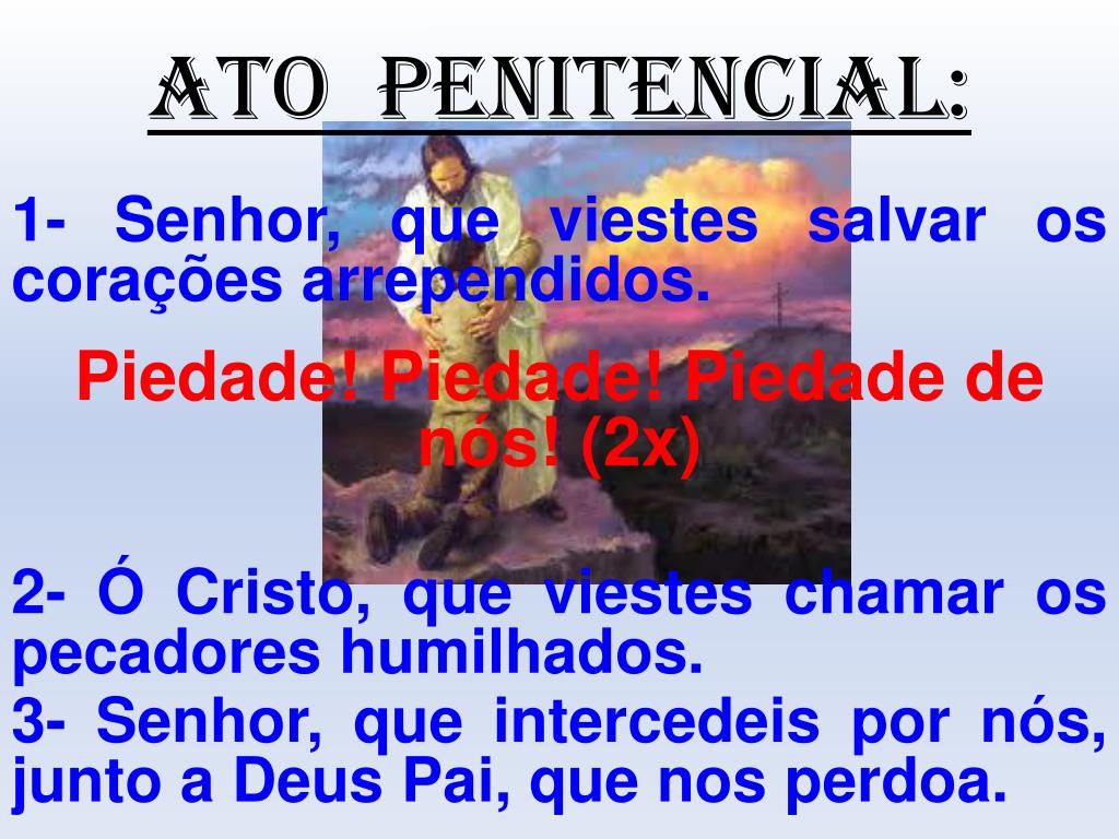 ATO PENITENCIAL: 1- Senhor, que viestes salvar os corações arrependidos. Piedade! Piedade! Piedade de nós! (2x) 2- Ó Cristo, que viestes chamar os pecadores humilhados. 3- Senhor, que intercedeis por nós, junto a Deus Pai, que nos perdoa.