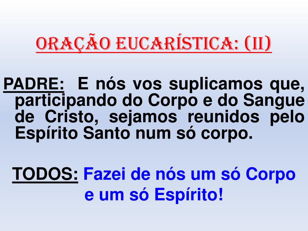 ORAÇÃO EUCARÍSTICA: (II) PADRE: E nós vos suplicamos que, participando do Corpo e do Sangue de Cristo, sejamos reunidos pelo Espírito Santo num só corpo. TODOS:Fazei de nós um só Corpo e um só Espírito!