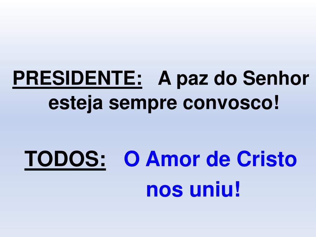 PRESIDENTE: A paz do Senhor esteja sempre convosco! TODOS:O Amor de Cristo nos uniu!