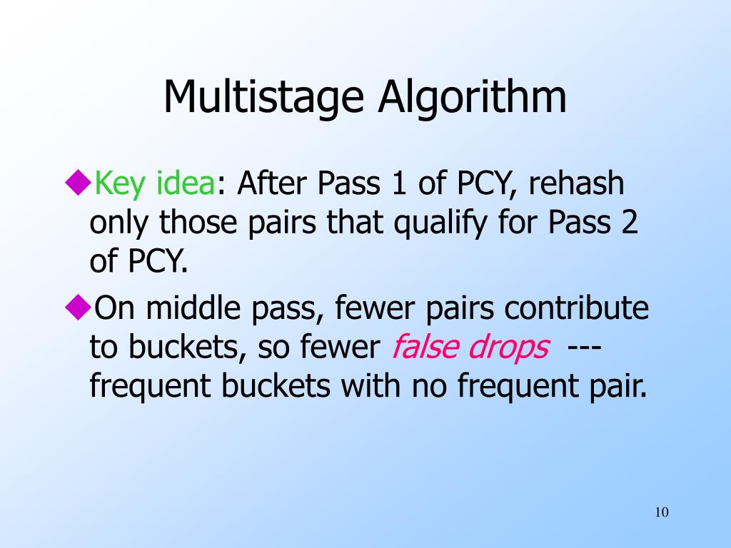 Multistage Algorithm • Key idea: After Pass 1 of PCY, rehash only those pairs that qualify for Pass 2 of PCY. • On middle pass, fewer pairs contribute to buckets, so fewer false drops --- frequent buckets with no frequent pair.