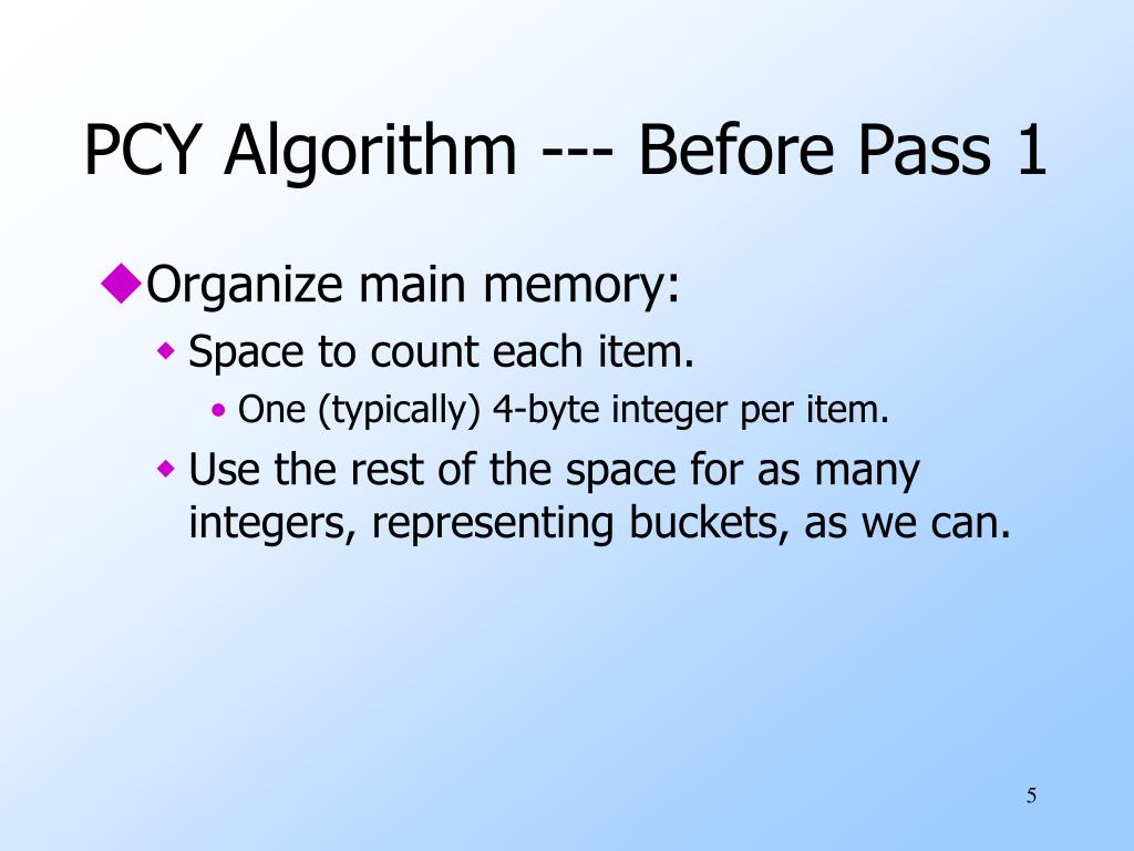 PCY Algorithm --- Before Pass 1 • Organize main memory: • Space to count each item. • One (typically) 4-byte integer per item. • Use the rest of the space for as many integers, representing buckets, as we can.