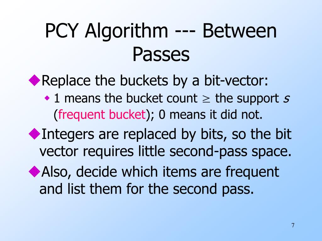 PCY Algorithm --- Between Passes • Replace the buckets by a bit-vector: • 1 means the bucket count ≥ the support s (frequent bucket); 0 means it did not. • Integers are replaced by bits, so the bit vector requires little second-pass space. • Also, decide which items are frequent and list them for the second pass.
