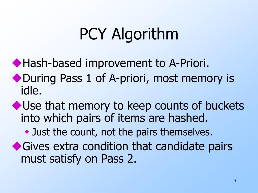 PCY Algorithm • Hash-based improvement to A-Priori. • During Pass 1 of A-priori, most memory is idle. • Use that memory to keep counts of buckets into which pairs of items are hashed. • Just the count, not the pairs themselves. • Gives extra condition that candidate pairs must satisfy on Pass 2.