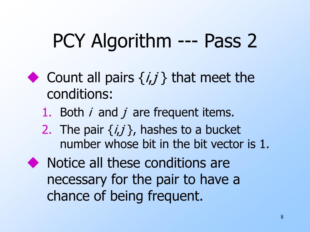PCY Algorithm --- Pass 2 • Count all pairs {i,j } that meet the conditions: • Both i and j are frequent items. • The pair {i,j }, hashes to a bucket number whose bit in the bit vector is 1. • Notice all these conditions are necessary for the pair to have a chance of being frequent.