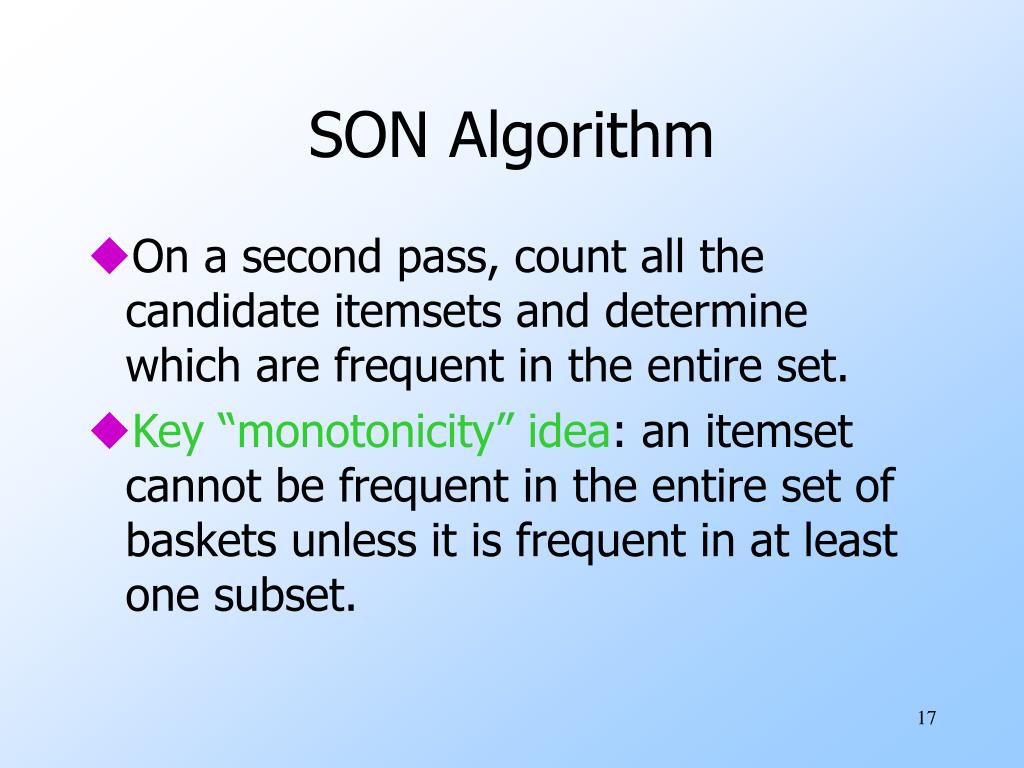 SON Algorithm • On a second pass, count all the candidate itemsets and determine which are frequent in the entire set. • Key “monotonicity” idea: an itemset cannot be frequent in the entire set of baskets unless it is frequent in at least one subset.