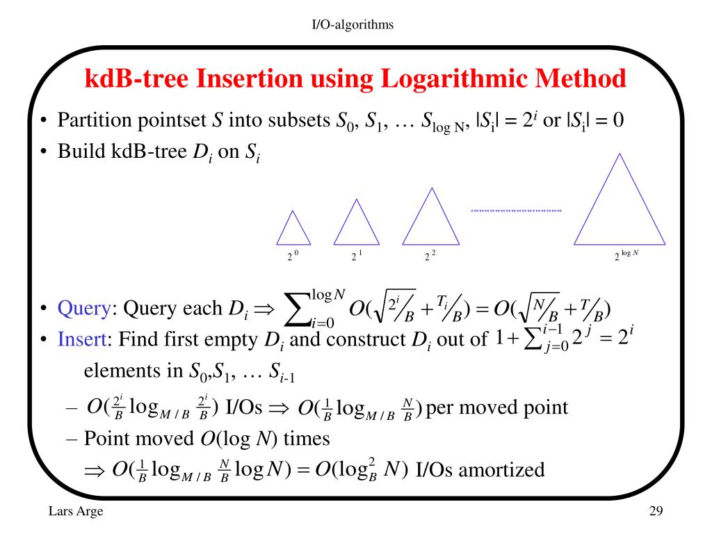 I/O-algorithms kdB-tree Insertion using Logarithmic Method • Partition pointset S into subsets S0, S1, … Slog N, |Si| = 2i or |Si| = 0 • Build kdB-tree Di on Si • Query: Query each Di • Insert: Find first empty Diand construct Di out of elements in S0,S1, … Si-1 • I/Os per moved point • Point moved O(log N) times I/Os amortized