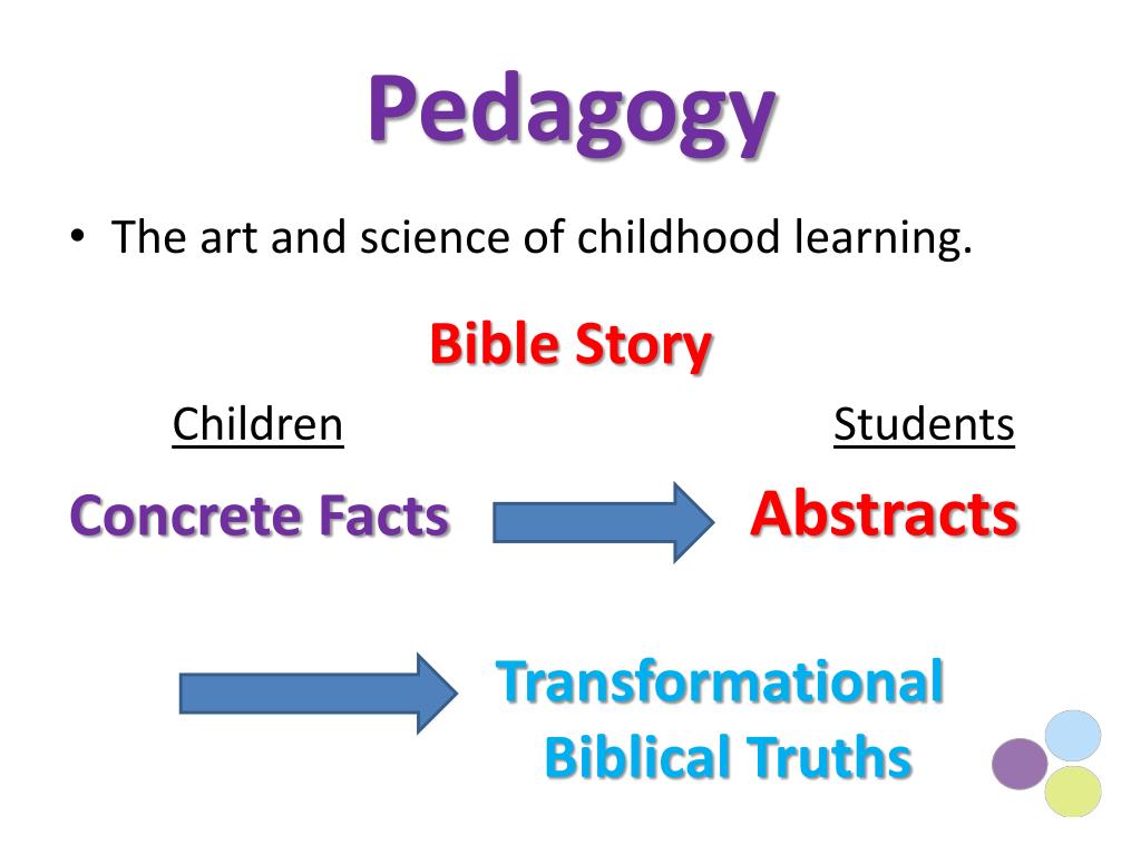 Pedagogy • The art and science of childhood learning. Bible Story ChildrenStudents Concrete Facts Abstracts Transformational Biblical Truths
