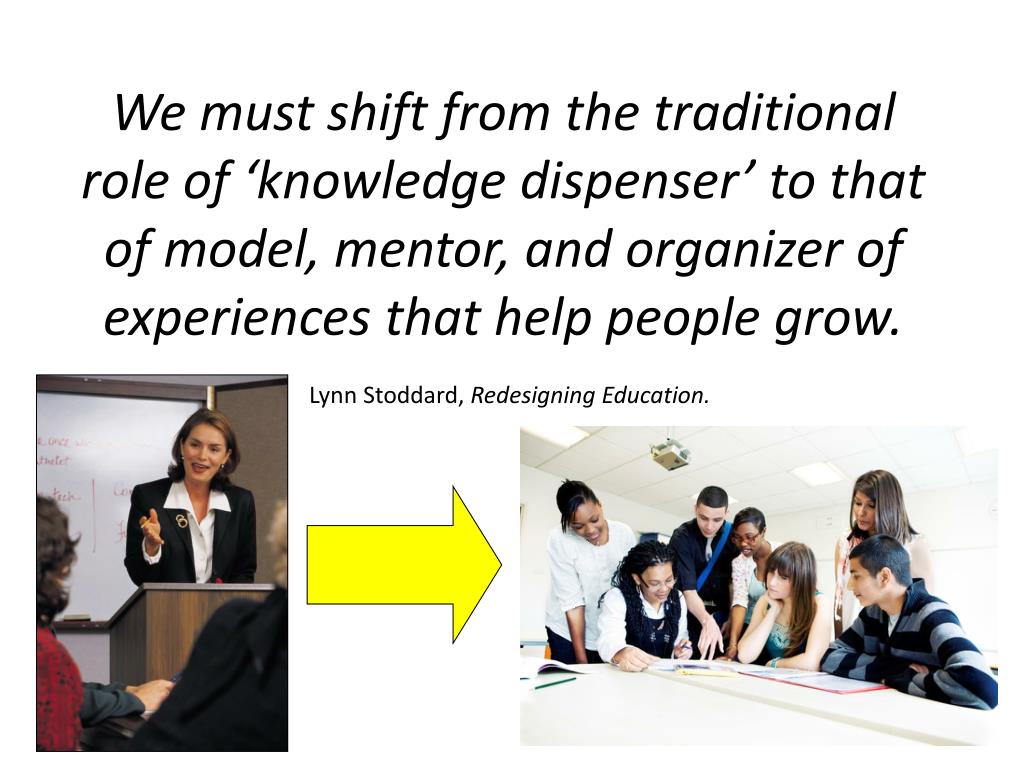 We must shift from the traditional role of ‘knowledge dispenser’ to that of model, mentor, and organizer of experiences that help people grow. Lynn Stoddard, Redesigning Education.