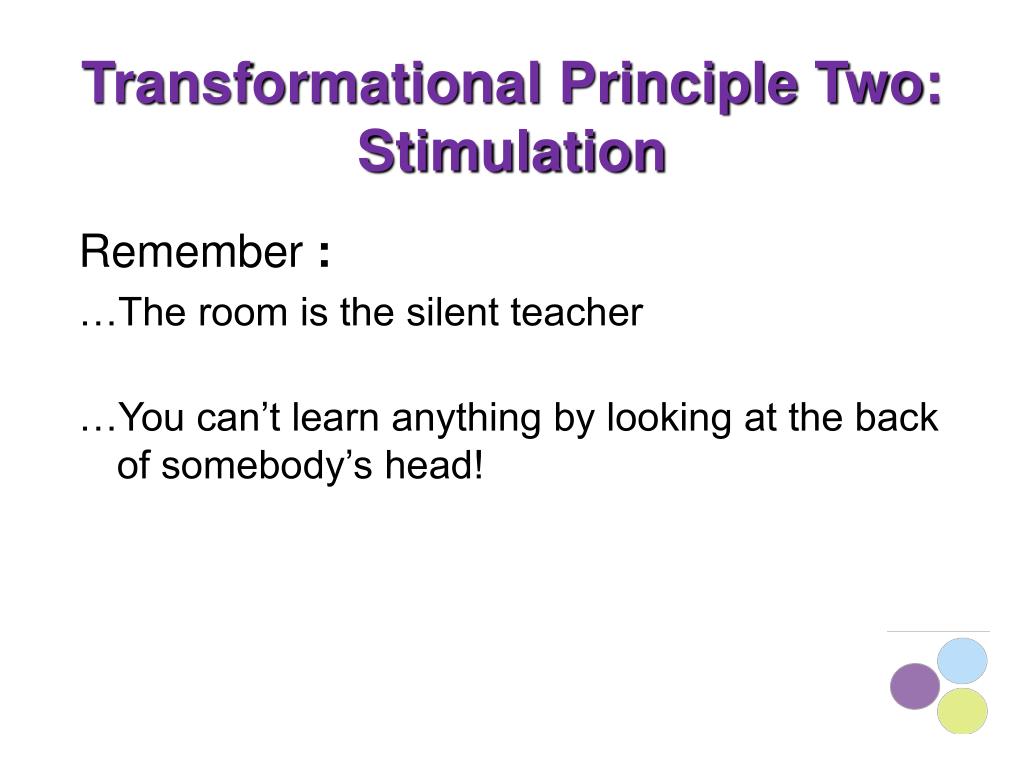 Transformational Principle Two: Stimulation Remember : …The room is the silent teacher …You can’t learn anything by looking at the back of somebody’s head!