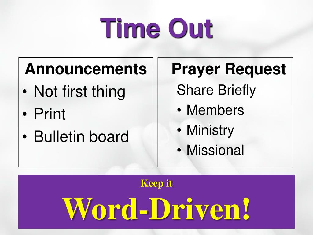 Time Out Prayer Request Share Briefly • Members • Ministry • Missional • Announcements • Not first thing • Print • Bulletin board Keep it Word-Driven!