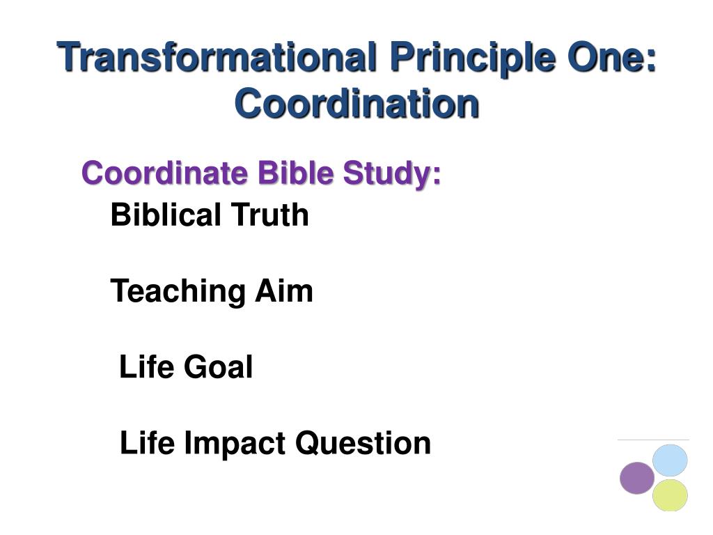 Transformational Principle One: Coordination Coordinate Bible Study: Biblical Truth Teaching Aim Life Goal Life Impact Question