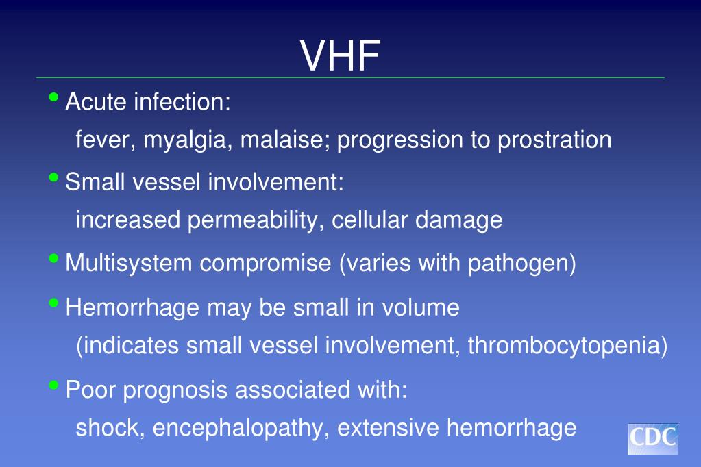 VHF • Acute infection: fever, myalgia, malaise; progression to prostration • Small vessel involvement: increased permeability, cellular damage • Multisystem compromise (varies with pathogen) • Hemorrhage may be small in volume (indicates small vessel involvement, thrombocytopenia) • Poor prognosis associated with: shock, encephalopathy, extensive hemorrhage