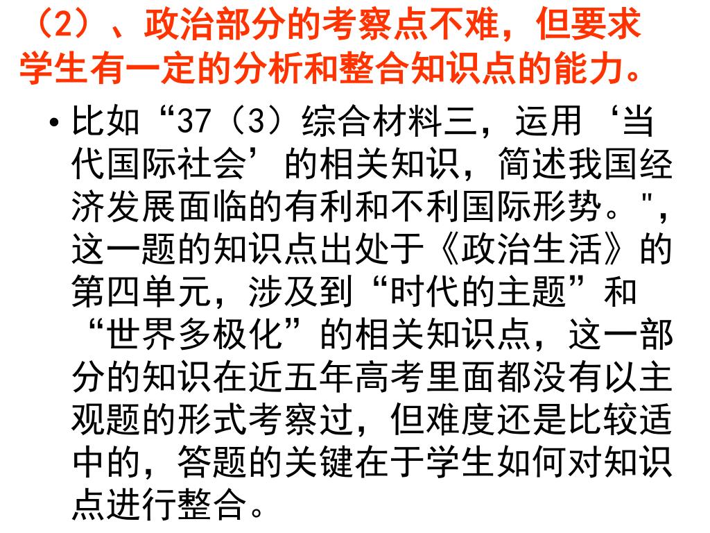 (2)、政治部分的考察点不难,但要求学生有一定的分析和整合知识点的能力。(2)、政治部分的考察点不难,但要求学生有一定的分析和整合知识点的能力。 • 比如“37(3)综合材料三,运用‘当代国际社会’的相关知识,简述我国经济发展面临的有利和不利国际形势。",这一题的知识点出处于《政治生活》的第四单元,涉及到“时代的主题”和“世界多极化”的相关知识点,这一部分的知识在近五年高考里面都没有以主观题的形式考察过,但难度还是比较适中的,答题的关键在于学生如何对知识点进行整合。