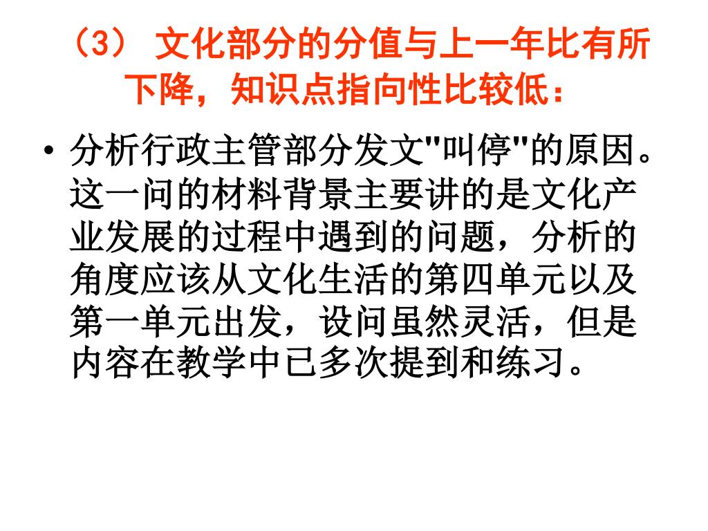 (3)文化部分的分值与上一年比有所下降,知识点指向性比较低:(3)文化部分的分值与上一年比有所下降,知识点指向性比较低: • 分析行政主管部分发文"叫停"的原因。这一问的材料背景主要讲的是文化产业发展的过程中遇到的问题,分析的角度应该从文化生活的第四单元以及第一单元出发,设问虽然灵活,但是内容在教学中已多次提到和练习。