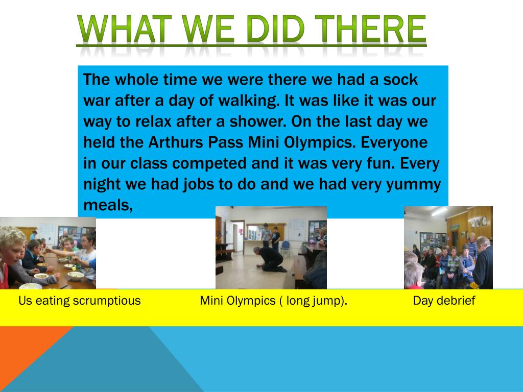 What we did there The whole time we were there we had a sock war after a day of walking. It was like it was our way to relax after a shower. On the last day we held the Arthurs Pass Mini Olympics. Everyone in our class competed and it was very fun. Every night we had jobs to do and we had very yummy meals, Us eating scrumptious Mini Olympics ( long jump). Day debrief