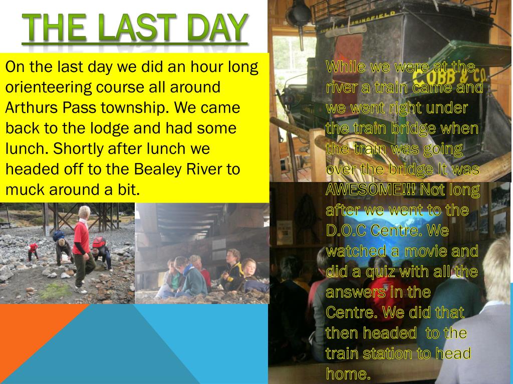 The last day On the last day we did an hour long orienteering course all around Arthurs Pass township. We came back to the lodge and had some lunch. Shortly after lunch we headed off to the Bealey River to muck around a bit. While we were at the river a train came and we went right under the train bridge when the train was going over the bridge It was AWESOME!!! Not long after we went to the D.O.C Centre. We watched a movie and did a quiz with all the answers in the Centre. We did that then headed to the train station to head home.