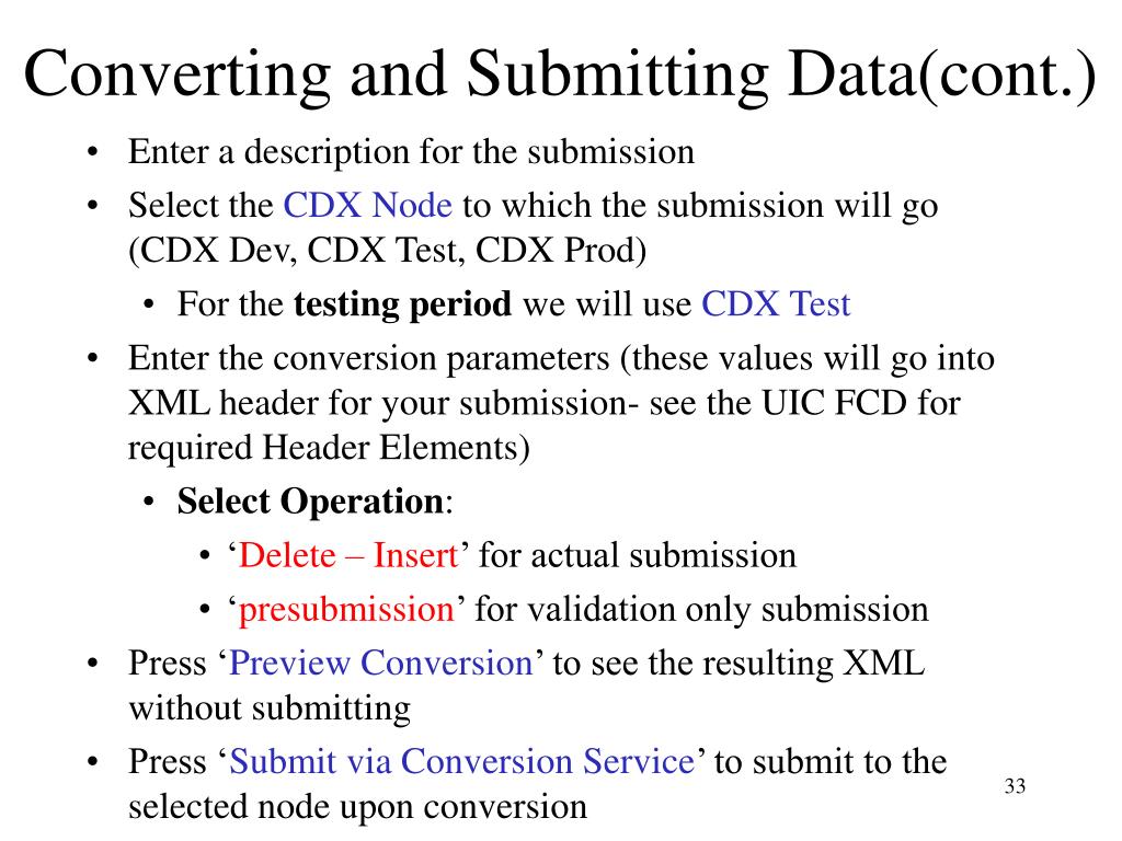 Converting and Submitting Data (cont.) • The ‘Submit via Conversion Service’ screen will be displayed
