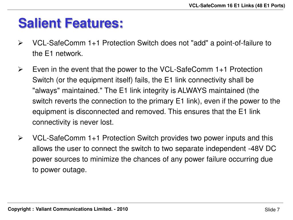 V aliant C ommunications L imited. Telecom Transmission Solutions. VCL-SafeComm 16 E1 Links (48 E1 Ports) (1+1 Automatic Protection Switch) Product Presentation. Updated: April, 2010. Product Overview.