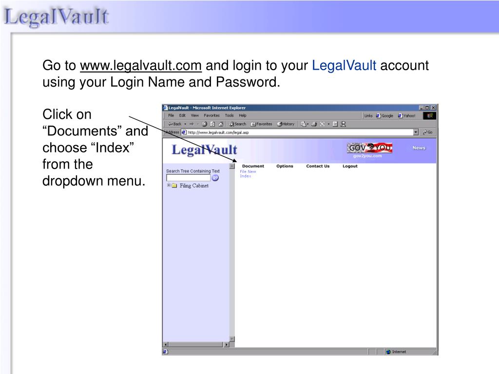 Go to www.legalvault.com and login to your LegalVault account using your Login Name and Password. Click on “Documents” and choose “Index” from the dropdown menu.