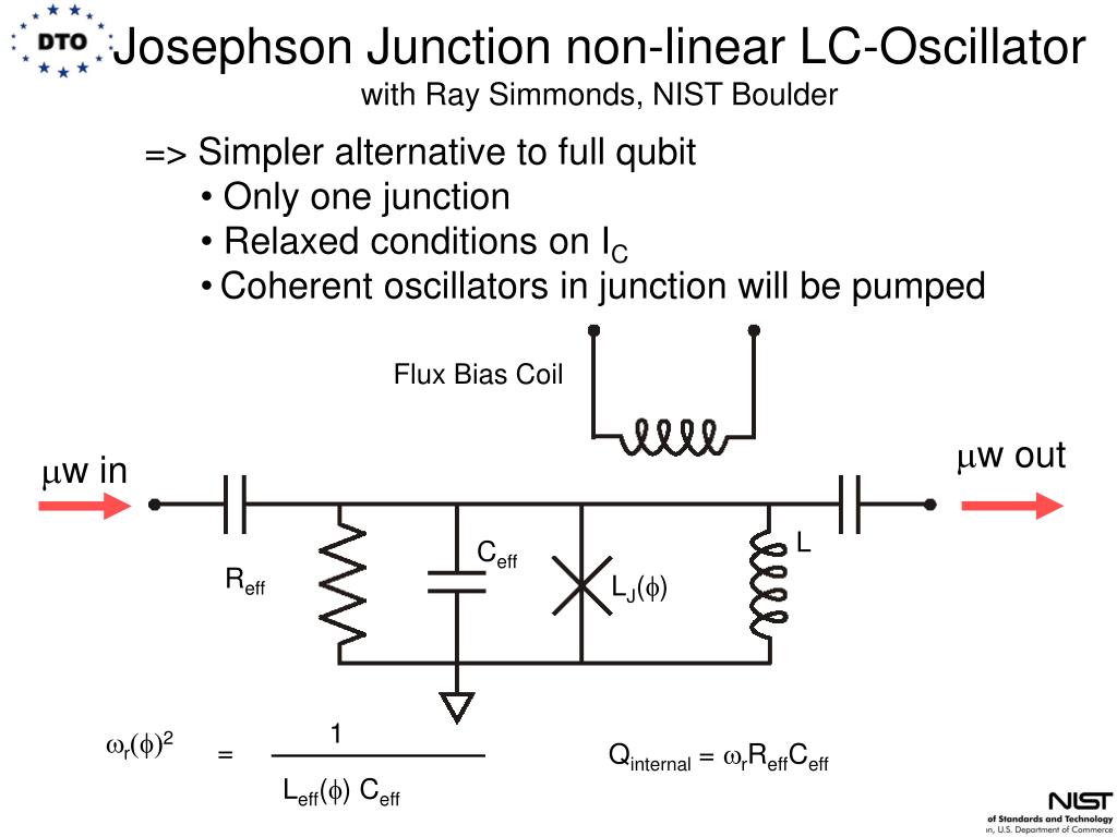 1 wr(f)2 = Leff(f) Ceff Josephson Junction non-linear LC-Oscillatorwith Ray Simmonds, NIST Boulder • => Simpler alternative to full qubit • Only one junction • Relaxed conditions on IC • Coherent oscillators in junction will be pumped Flux Bias Coil w out w in L Ceff Reff LJ(f) Qinternal = wrReffCeff