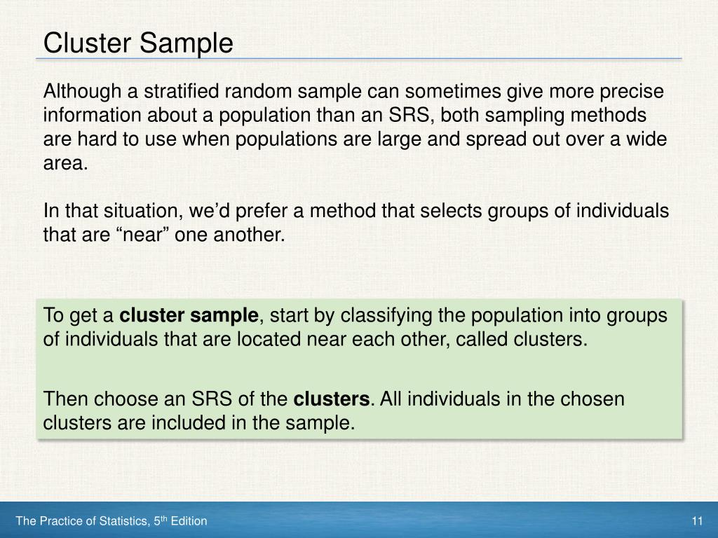 Cluster Sample Although a stratified random sample can sometimes give more precise information about a population than an SRS, both sampling methods are hard to use when populations are large and spread out over a wide area. In that situation, we’d prefer a method that selects groups of individuals that are “near” one another. To get a cluster sample, start by classifying the population into groups of individuals that are located near each other, called clusters. Then choose an SRS of the clusters. All individuals in the chosen clusters are included in the sample.