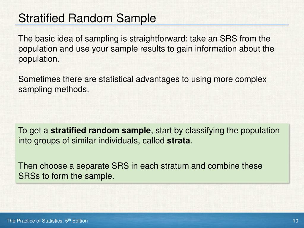 Stratified Random Sample The basic idea of sampling is straightforward: take an SRS from the population and use your sample results to gain information about the population. Sometimes there are statistical advantages to using more complex sampling methods. To get a stratified random sample, start by classifying the population into groups of similar individuals, called strata. Then choose a separate SRS in each stratum and combine these SRSs to form the sample.
