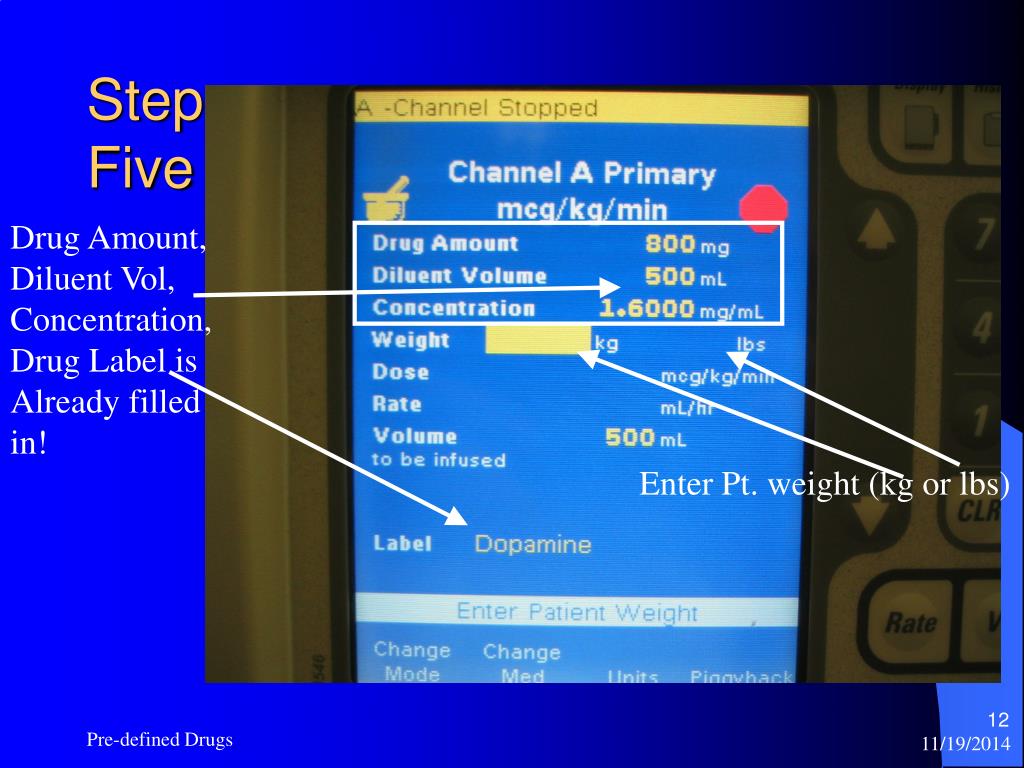 StepFive Drug Amount, Diluent Vol, Concentration, Drug Label is Already filled in! Enter Pt. weight (kg or lbs) Pre-defined Drugs