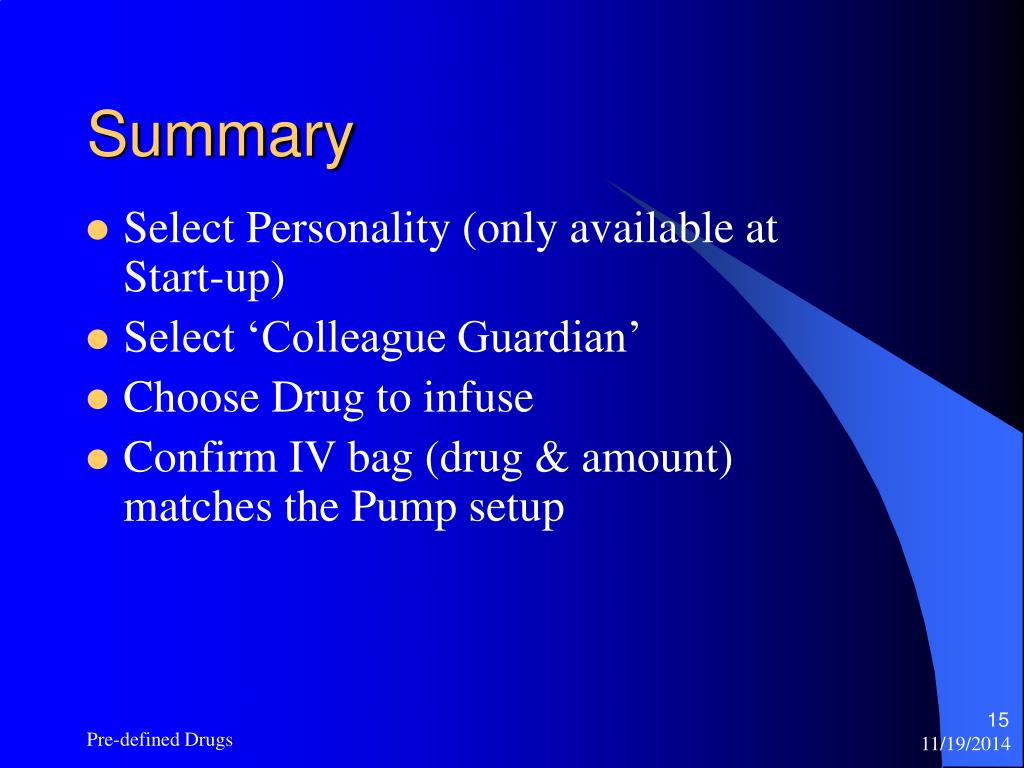 Select Personality (only available at Start-up) Select ‘Colleague Guardian’ Choose Drug to infuse Confirm IV bag (drug & amount) matches the Pump setup Summary Pre-defined Drugs