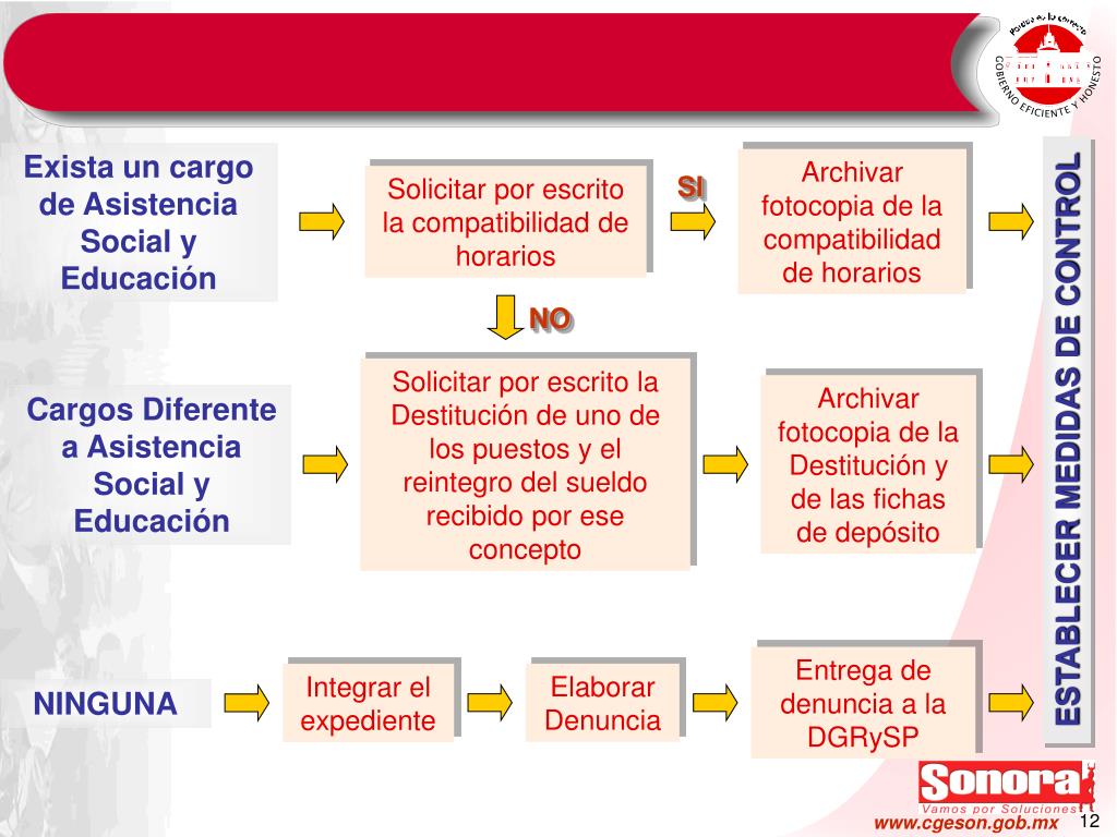 Exista un cargo de Asistencia Social y Educación Archivar fotocopia de la compatibilidad de horarios SI Solicitar por escrito la compatibilidad de horarios NO Solicitar por escrito la Destitución de uno de los puestos y el reintegro del sueldo recibido por ese concepto Archivar fotocopia de la Destitución y de las fichas de depósito Cargos Diferente a Asistencia Social y Educación ESTABLECER MEDIDAS DE CONTROL Entrega de denuncia a la DGRySP Elaborar Denuncia Integrar el expediente NINGUNA