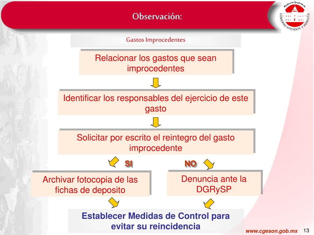 Observación: Gastos Improcedentes Relacionar los gastos que sean improcedentes Identificar los responsables del ejercicio de este gasto Solicitar por escrito el reintegro del gasto improcedente SI NO Denuncia ante la DGRySP Archivar fotocopia de las fichas de deposito Establecer Medidas de Control para evitar su reincidencia
