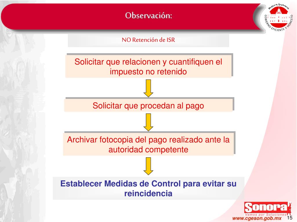 Observación: NO Retención de ISR Solicitar que relacionen y cuantifiquen el impuesto no retenido Solicitar que procedan al pago Archivar fotocopia del pago realizado ante la autoridad competente Establecer Medidas de Control para evitar su reincidencia