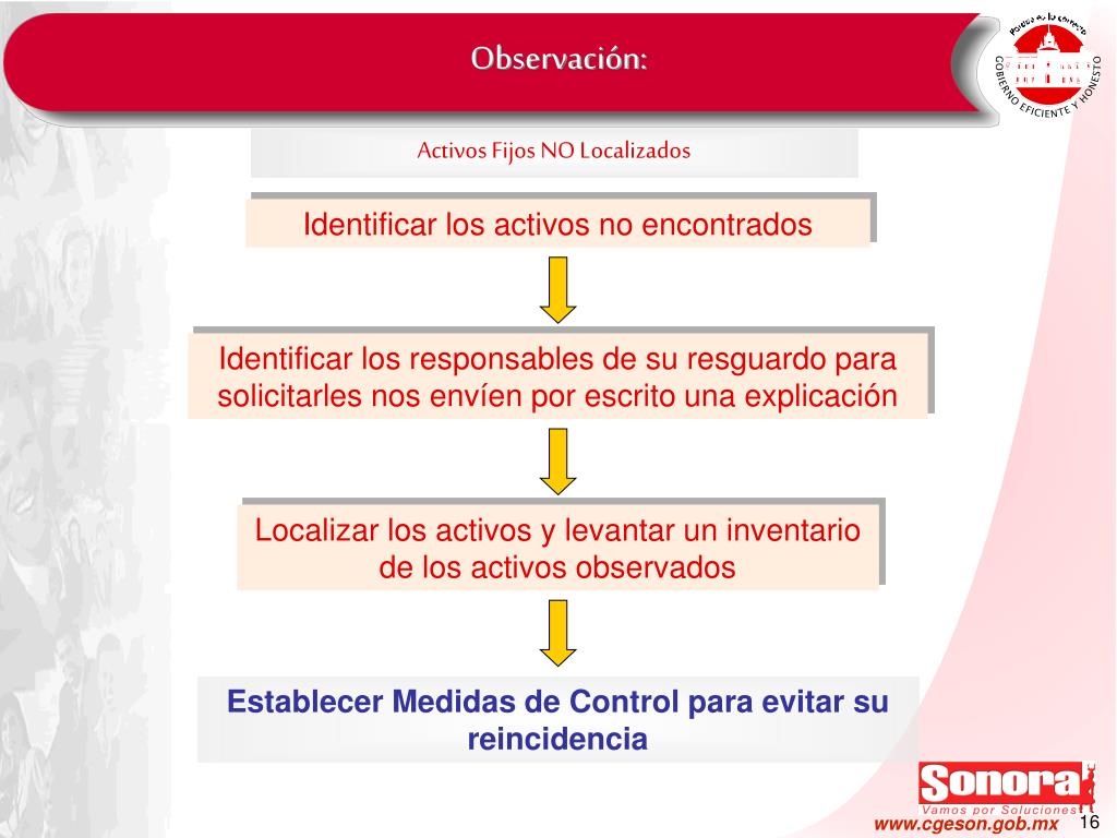Observación: Activos Fijos NO Localizados Identificar los activos no encontrados Identificar los responsables de su resguardo para solicitarles nos envíen por escrito una explicación Localizar los activos y levantar un inventario de los activos observados Establecer Medidas de Control para evitar su reincidencia