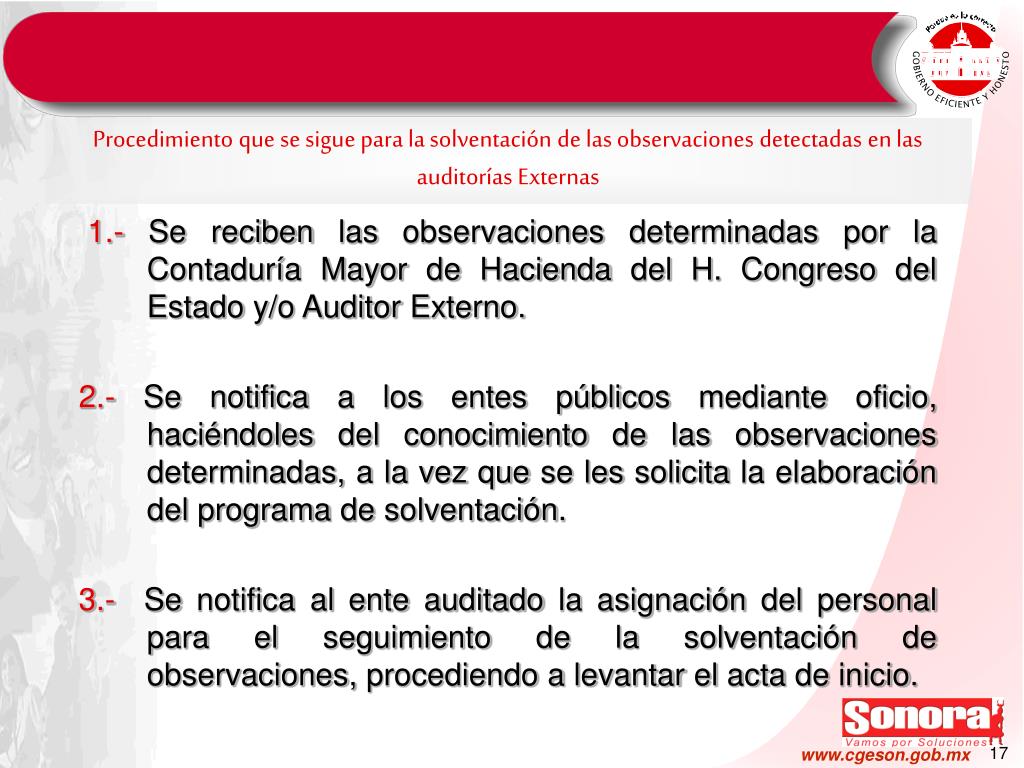 1.- Se reciben las observaciones determinadas por la Contaduría Mayor de Hacienda del H. Congreso del Estado y/o Auditor Externo. 2.- Se notifica a los entes públicos mediante oficio, haciéndoles del conocimiento de las observaciones determinadas, a la vez que se les solicita la elaboración del programa de solventación. 3.- Se notifica al ente auditado la asignación del personalpara el seguimiento de la solventación de observaciones, procediendo a levantar el acta de inicio. Procedimiento que se sigue para la solventación de las observaciones detectadas en las auditorías Externas