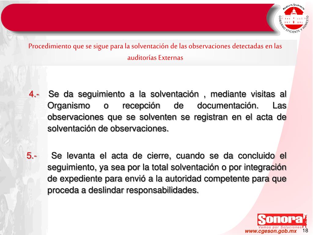 4.- Se da seguimiento a la solventación , mediante visitas al Organismo o recepción de documentación. Las observaciones que se solventen se registran en el acta de solventación de observaciones. 5.- Se levanta el acta de cierre, cuando se da concluido el seguimiento, ya sea por la total solventación o por integración de expediente para envió a la autoridad competente para que proceda a deslindar responsabilidades. Procedimiento que se sigue para la solventación de las observaciones detectadas en las auditorías Externas