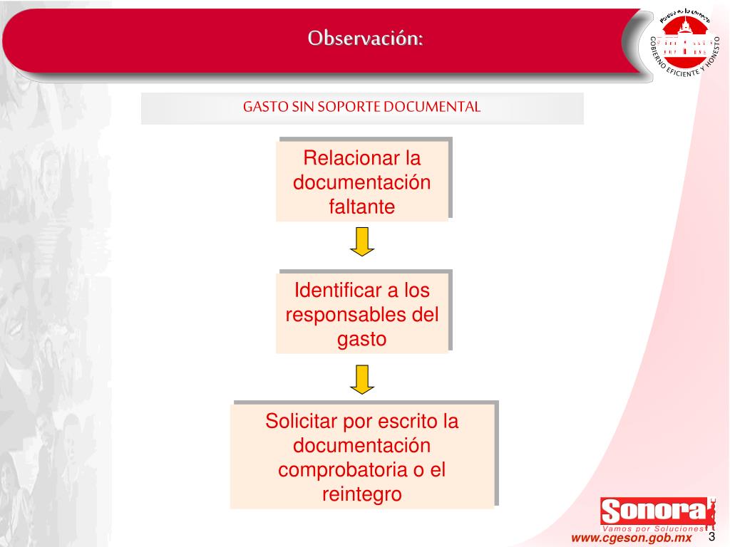 Observación: GASTO SIN SOPORTE DOCUMENTAL Relacionar la documentación faltante Identificar a los responsables del gasto Solicitar por escrito la documentación comprobatoria o el reintegro