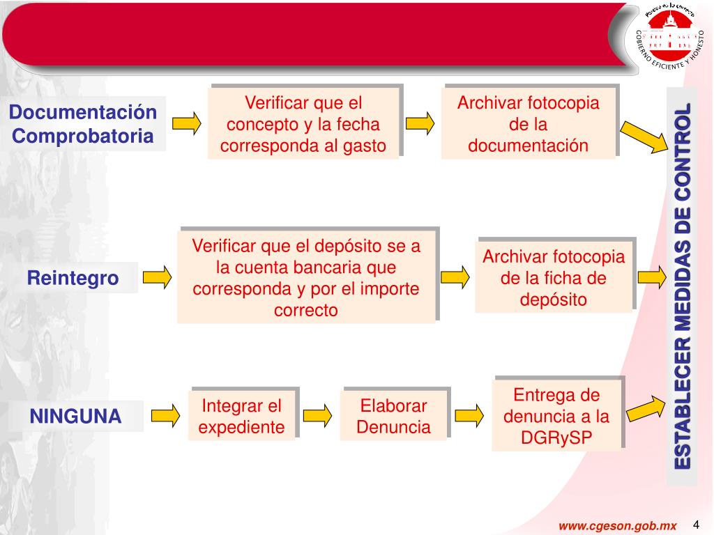 Verificar que el concepto y la fecha corresponda al gasto Archivar fotocopia de la documentación Documentación Comprobatoria Verificar que el depósito se a la cuenta bancaria que corresponda y por el importe correcto Archivar fotocopia de la ficha de depósito Reintegro ESTABLECER MEDIDAS DE CONTROL Entrega de denuncia a la DGRySP Integrar el expediente Elaborar Denuncia NINGUNA