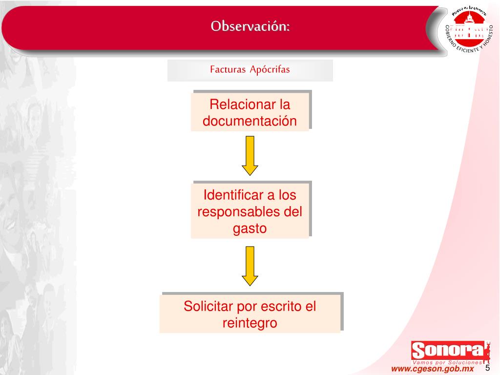 Observación: Facturas Apócrifas Relacionar la documentación Identificar a los responsables del gasto Solicitar por escrito el reintegro