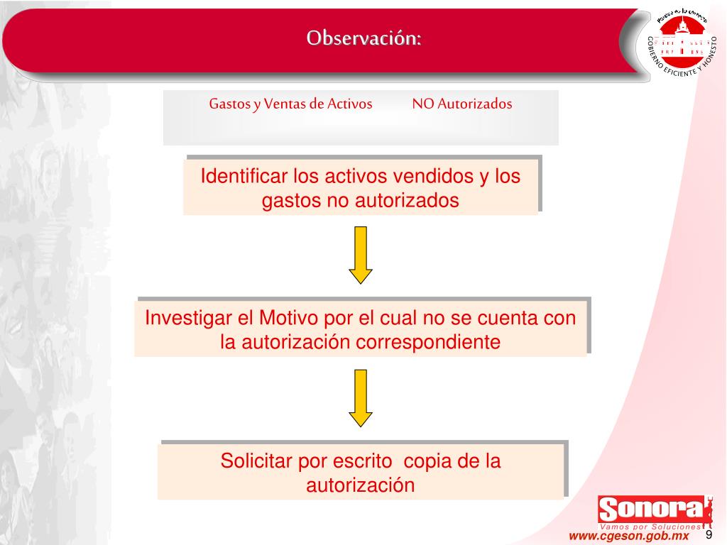 Observación: Gastos y Ventas de Activos NO Autorizados Identificar los activos vendidos y los gastos no autorizados Investigar el Motivo por el cual no se cuenta con la autorización correspondiente Solicitar por escrito copia de la autorización