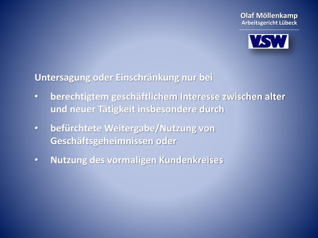 Untersagung oder Einschränkung nur bei • berechtigtem geschäftlichem Interesse zwischen alter und neuer Tätigkeit insbesondere durch • befürchtete Weitergabe/Nutzung von Geschäftsgeheimnissen oder • Nutzung des vormaligen Kundenkreises