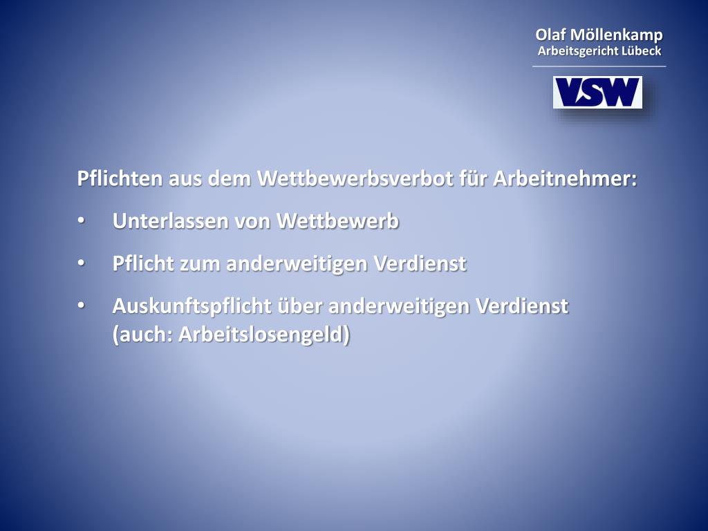 Pflichten aus dem Wettbewerbsverbot für Arbeitnehmer: • Unterlassen von Wettbewerb • Pflicht zum anderweitigen Verdienst • Auskunftspflicht über anderweitigen Verdienst(auch: Arbeitslosengeld)