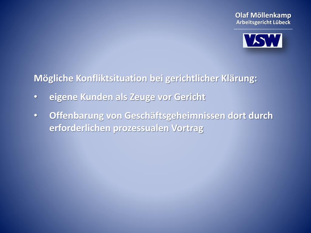 Mögliche Konfliktsituation bei gerichtlicher Klärung: • eigene Kunden als Zeuge vor Gericht • Offenbarung von Geschäftsgeheimnissen dort durch erforderlichen prozessualen Vortrag