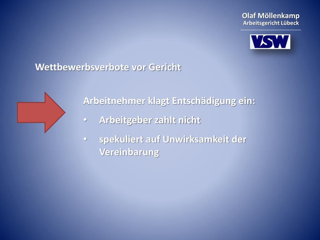 Wettbewerbsverbote vor Gericht • Arbeitnehmer klagt Entschädigung ein: • Arbeitgeber zahlt nicht • spekuliert auf Unwirksamkeit der Vereinbarung