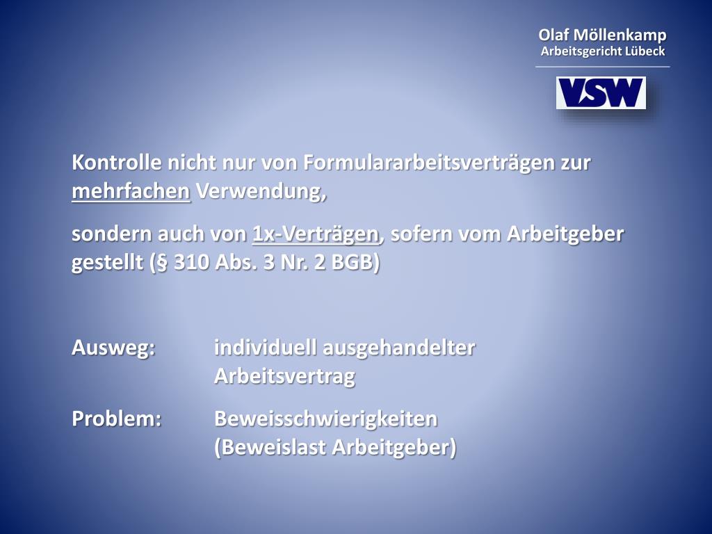Kontrolle nicht nur von Formulararbeitsverträgen zur mehrfachen Verwendung, sondern auch von 1x-Verträgen, sofern vom Arbeitgeber gestellt (§ 310 Abs. 3 Nr. 2 BGB) Ausweg: individuell ausgehandelter Arbeitsvertrag Problem: Beweisschwierigkeiten (Beweislast Arbeitgeber)