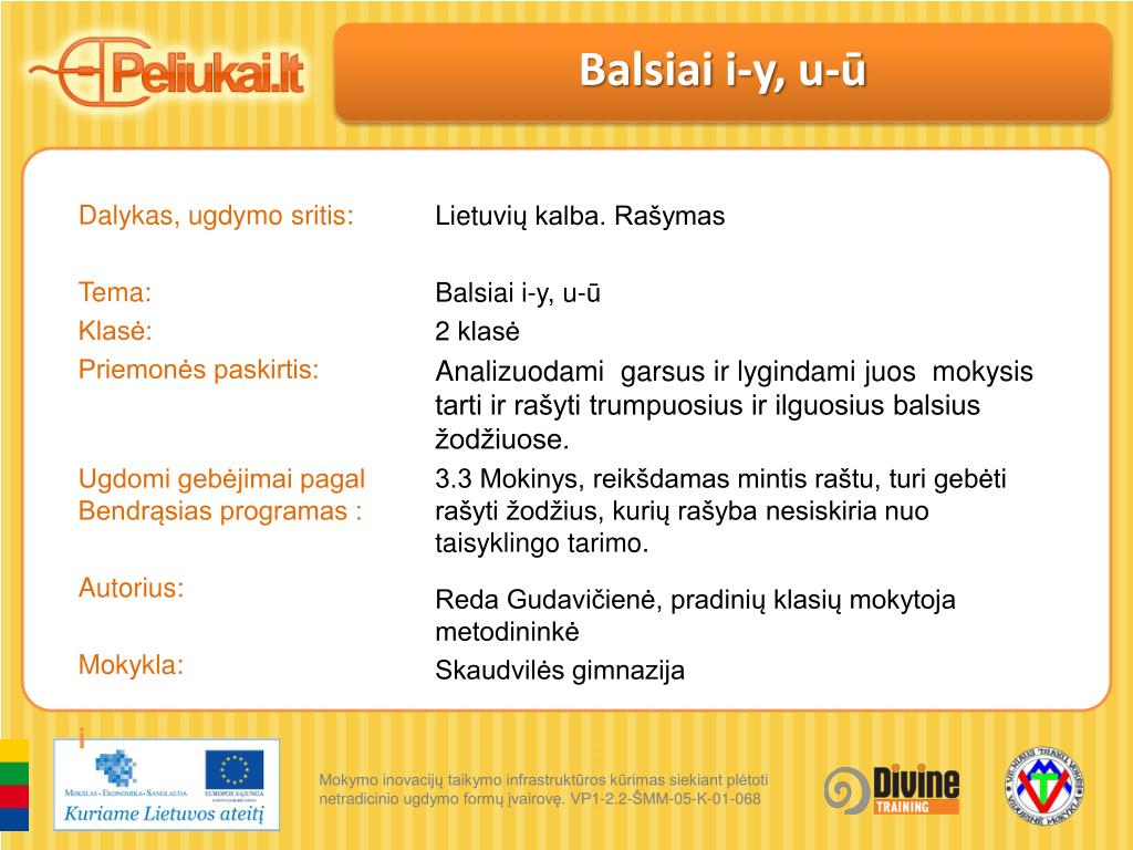 Balsiai i-y, u-ū Dalykas, ugdymo sritis: Tema: Klasė: Priemonės paskirtis: Ugdomi gebėjimai pagal Bendrąsias programas : Autorius: Mokykla: i Lietuvių kalba. Rašymas Balsiai i-y, u-ū 2 klasė Analizuodami garsus ir lygindami juos mokysis tarti ir rašyti trumpuosius ir ilguosius balsius žodžiuose. 3.3 Mokinys, reikšdamas mintis raštu, turi gebėti rašyti žodžius, kurių rašyba nesiskiria nuo taisyklingo tarimo. Reda Gudavičienė, pradinių klasių mokytoja metodininkė Skaudvilės gimnazija