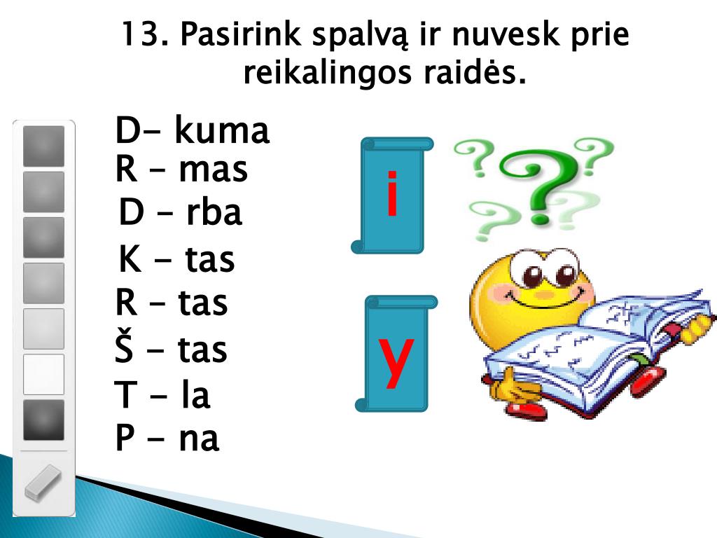 13. Pasirink spalvą ir nuvesk prie reikalingos raidės. i y T - la P - na D- kuma R – mas D – rba K - tas R – tas Š - tas