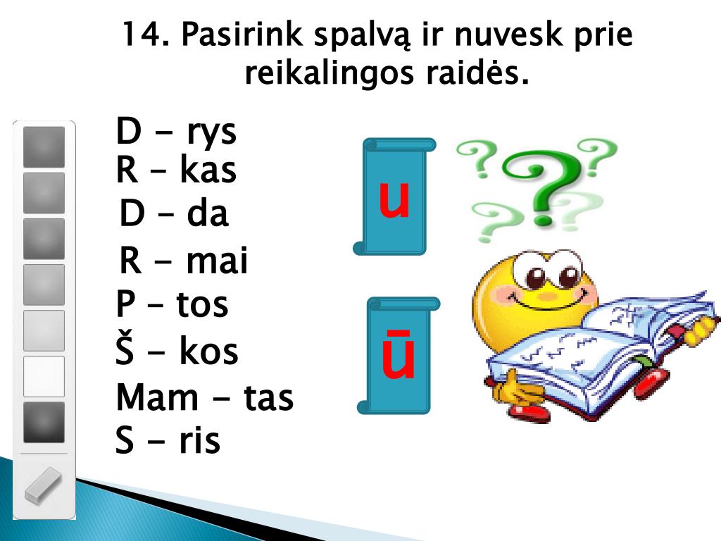 14. Pasirink spalvą ir nuvesk prie reikalingos raidės. u ū Mam- tas S - ris D - rys R – kas D – da R - mai P – tos Š - kos